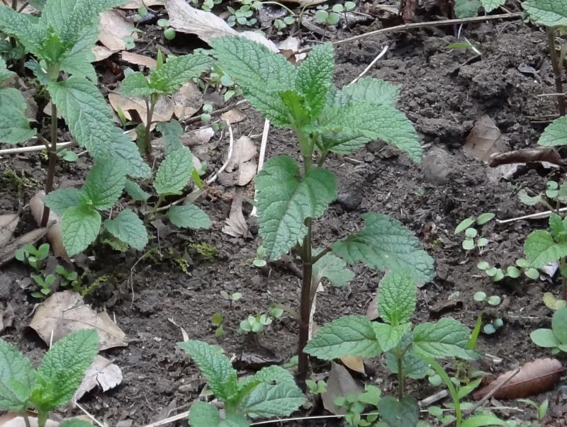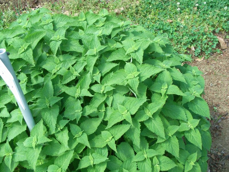 茎は四角で直立し、葉は先のとがった広卵形で鋸歯があり、