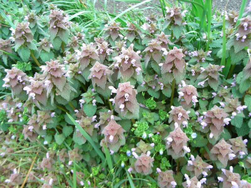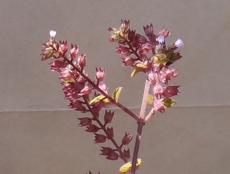 茎先の穂状花序に淡紅色の小さい唇形花を密集させる。