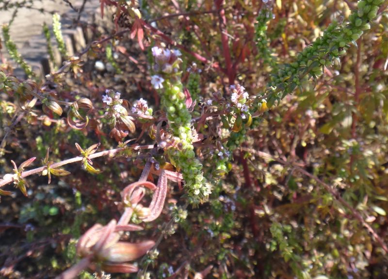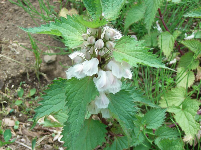 茎先の穂状花序に唇形の白い小さい花を密集させる。