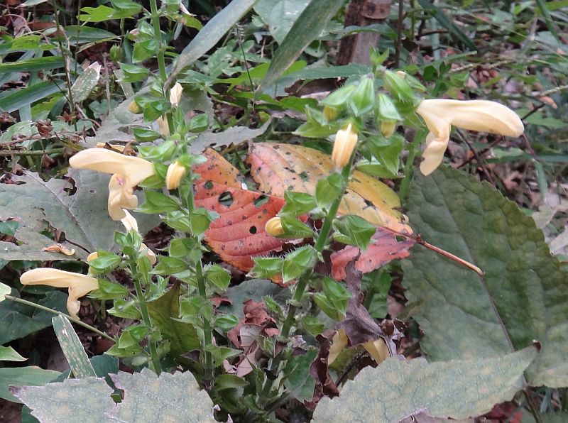 短い花穂に細長く立ち上がる唇形花がいくつか咲く