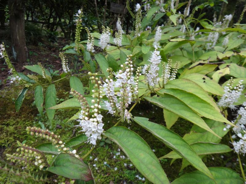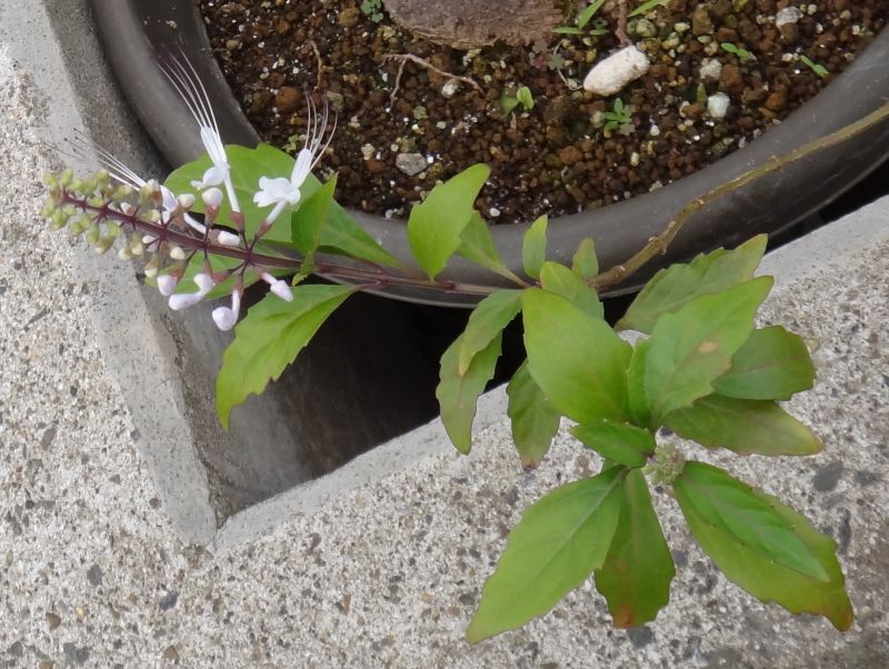 白〜淡紅色の唇形花が穂状に咲き、白い雄しべ、雌しべが長く突き出す