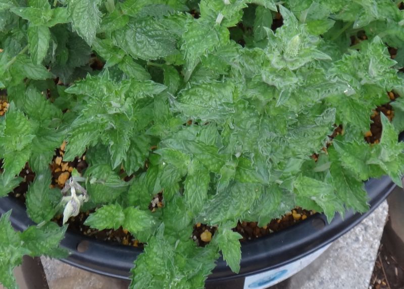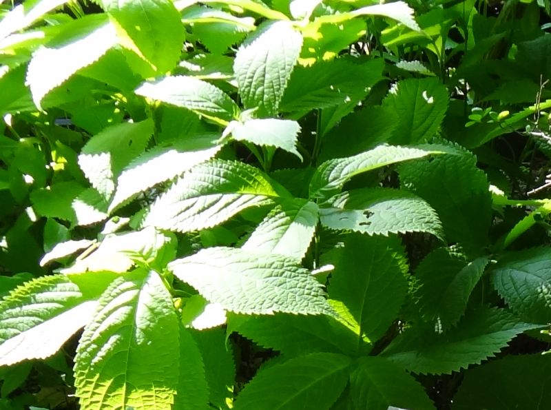 茎は直立し、葉は緑色の広卵形で鋸歯があり、