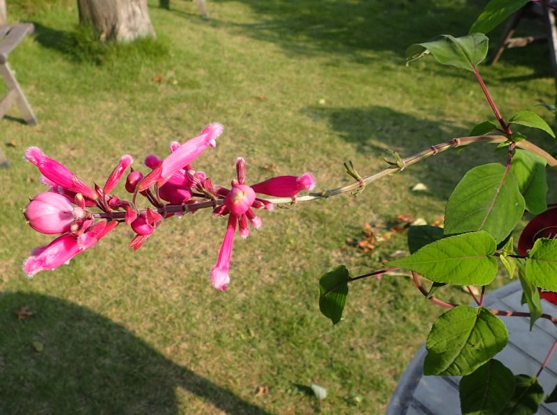 白い萼が袋状となり、中から赤い花冠が出て5裂し、