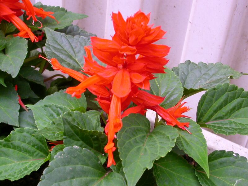 紫色の唇形の大きい花を2〜3個ずつ数段つける