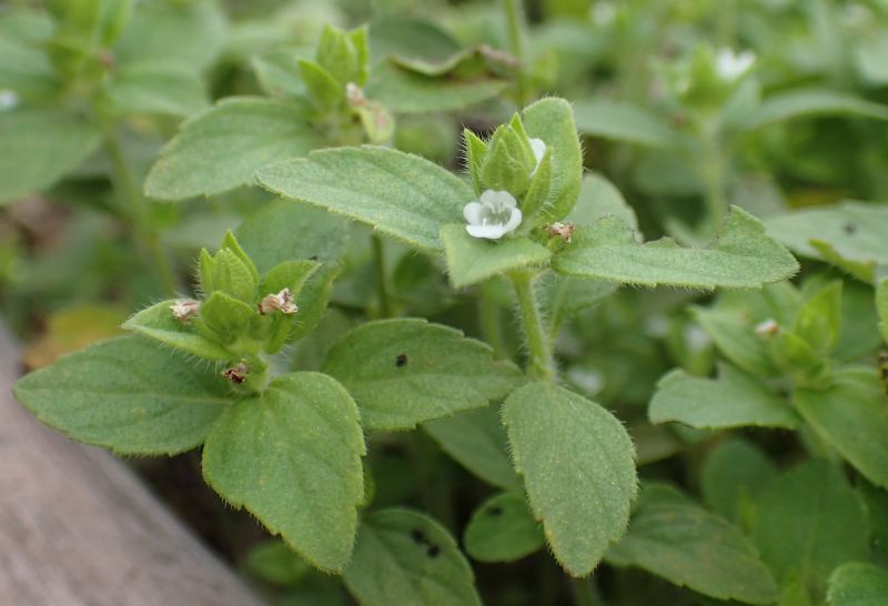多肉質で、葉は卵形で低い鋸歯があり、微毛があって、