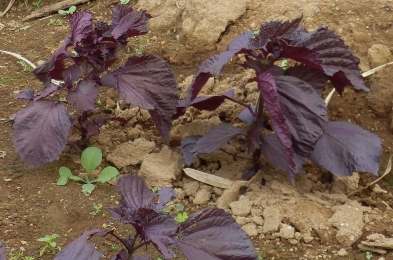 茎も葉も紫色をおびることが多く、葉は卵状長楕円形で、