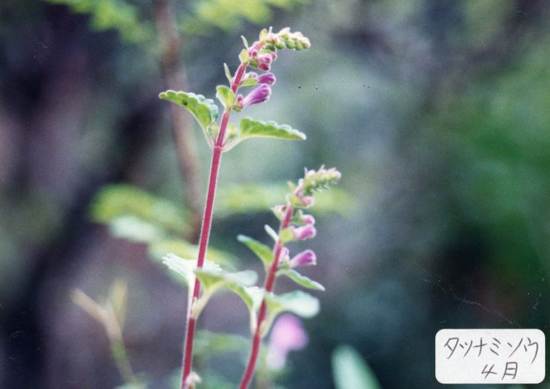 茎は四角で稜に短毛があり、葉には鋸歯が片側4〜6個あって裏面に腺点がある