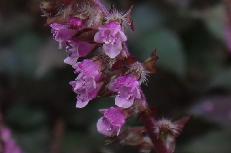 長さ4〜5ミリの紫色の唇形花を多数横向きにつける。