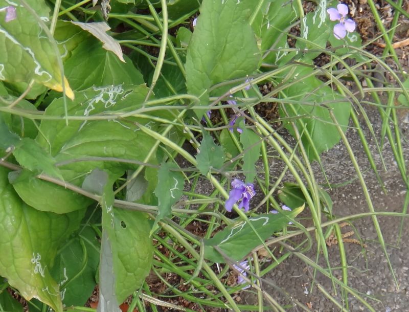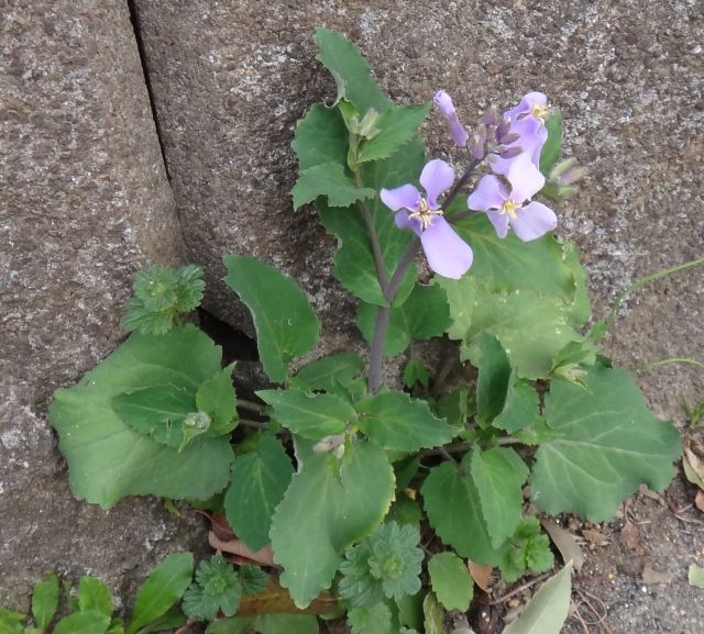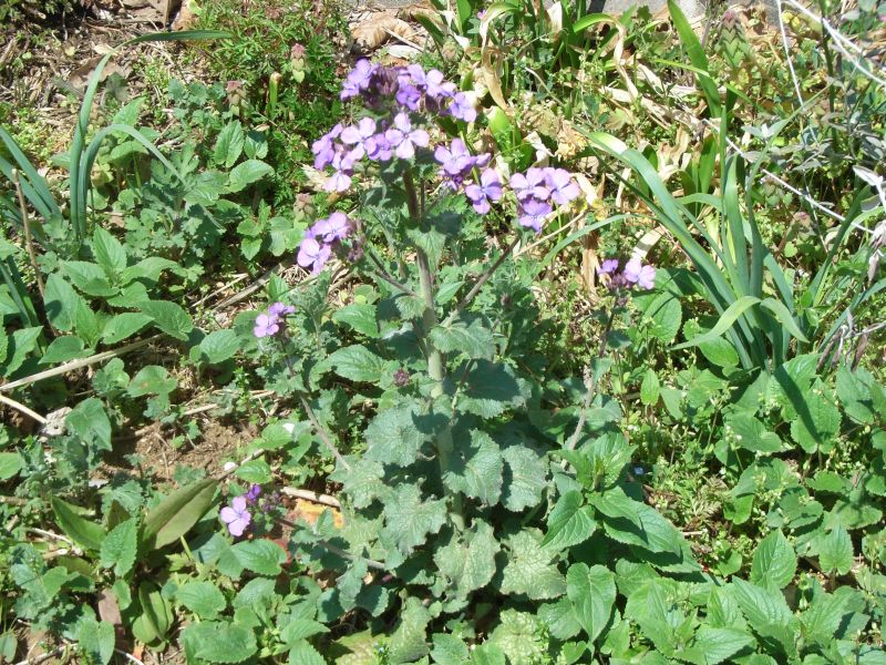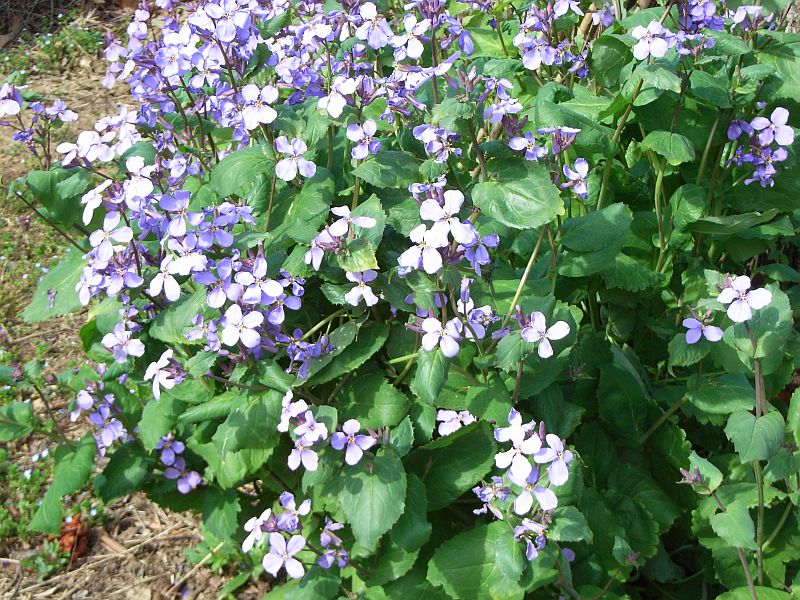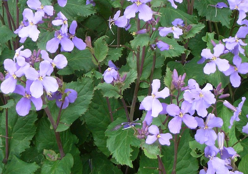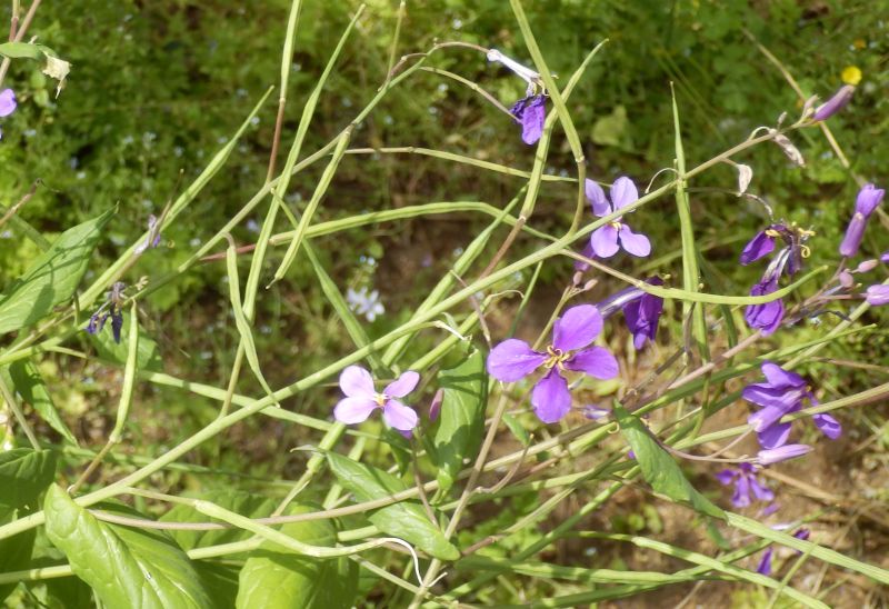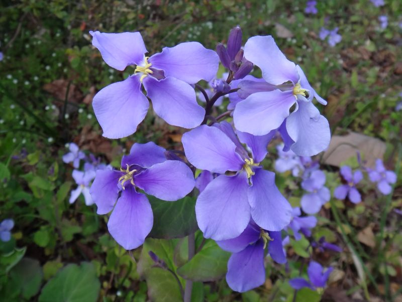 茎先の総状花序に、淡紫色か紅紫色で直径2〜3センチの4弁花が咲く。