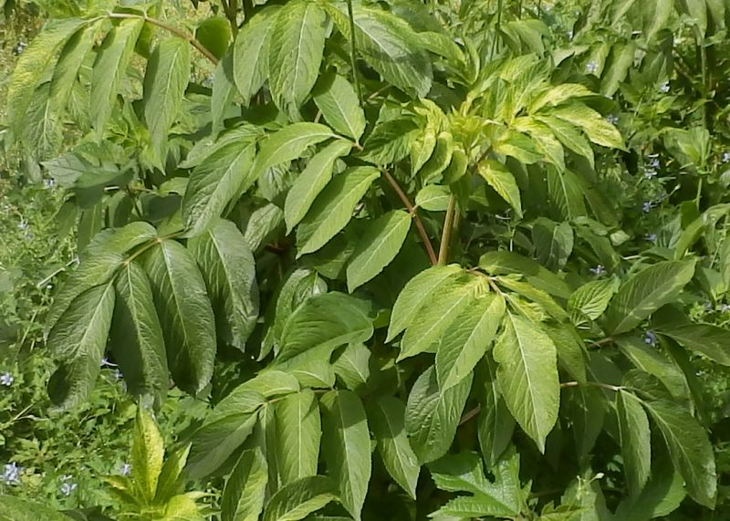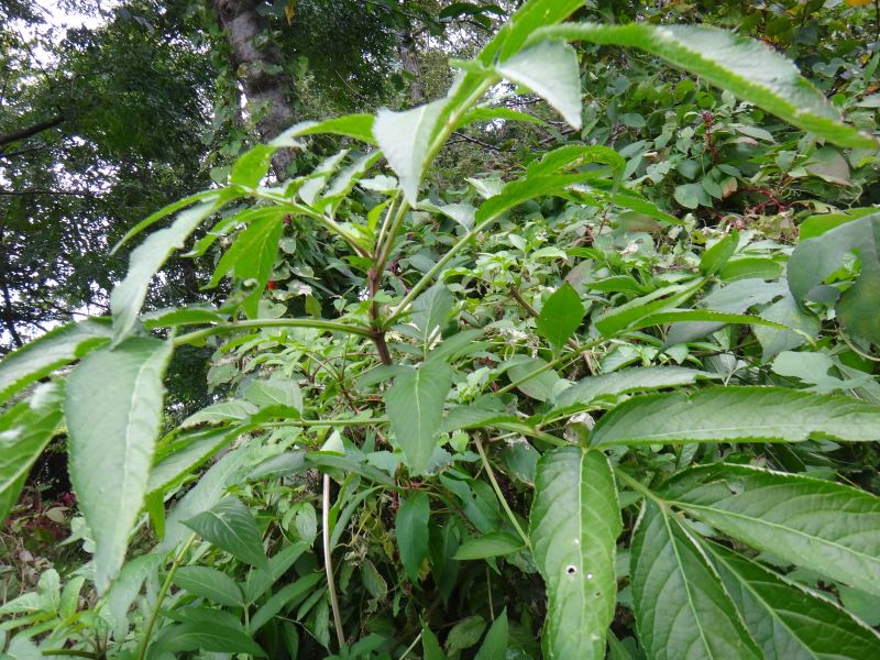 大きな奇数羽状複葉が対生し、小葉は長さ5〜17センチの広披針形で、細かい鋸歯がある。
