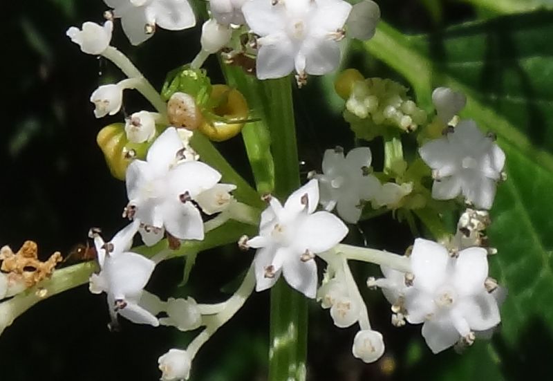 茎先に直径3〜4ミリの白い小さい花を円錐状に多数つける。