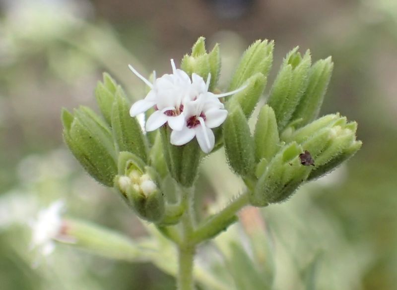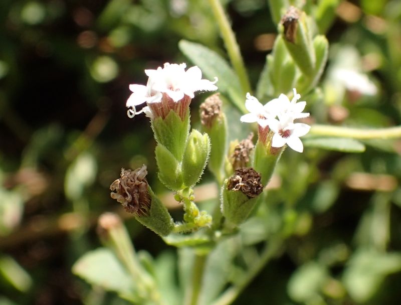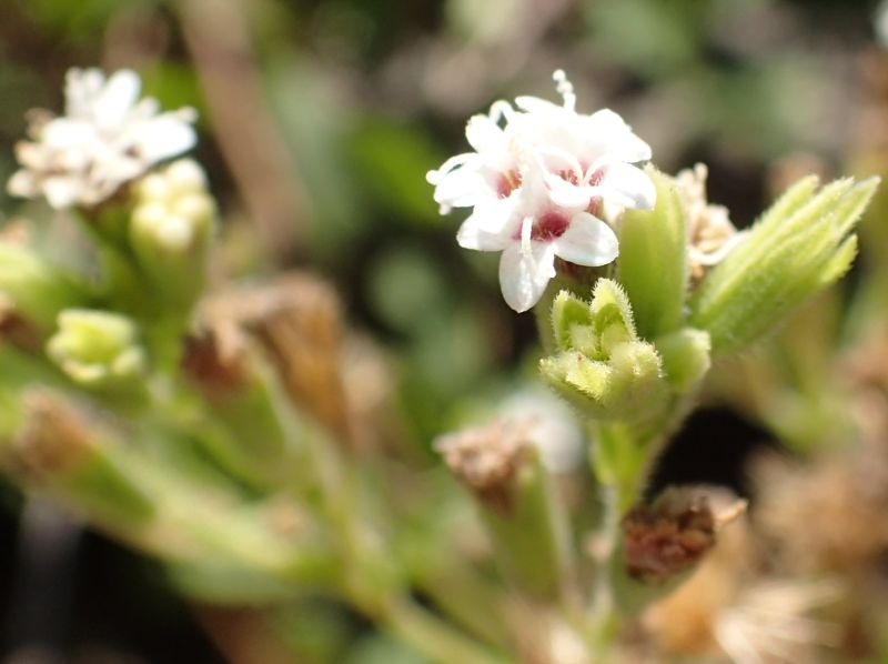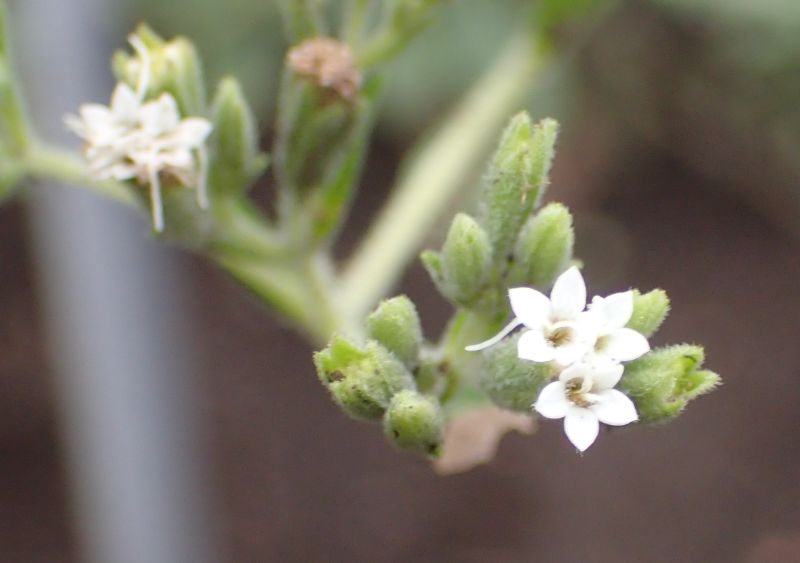 細長い萼筒の中に花がいくつか咲く。蕾が5個入った萼がある。