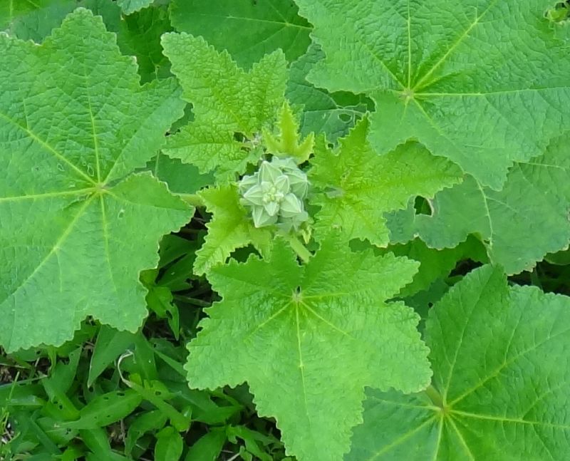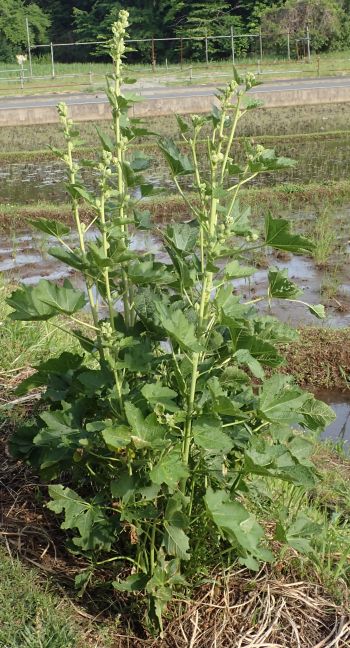 葉は直径10センチ強で互生し、掌状に5〜7浅裂し、浅い鋸歯がある。