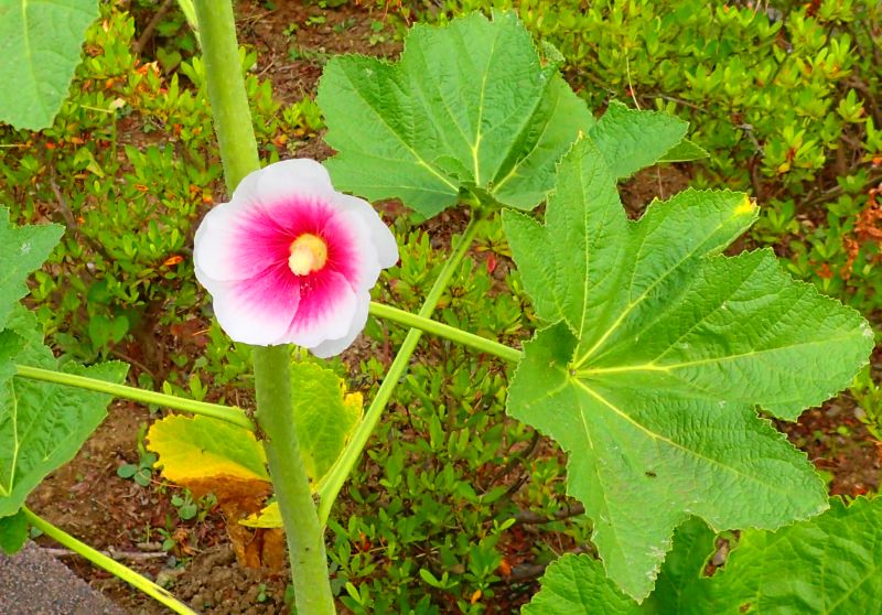 花色には赤、淡紅色、白など、各種ある。長い葉柄が互生する。(2017/6/29)