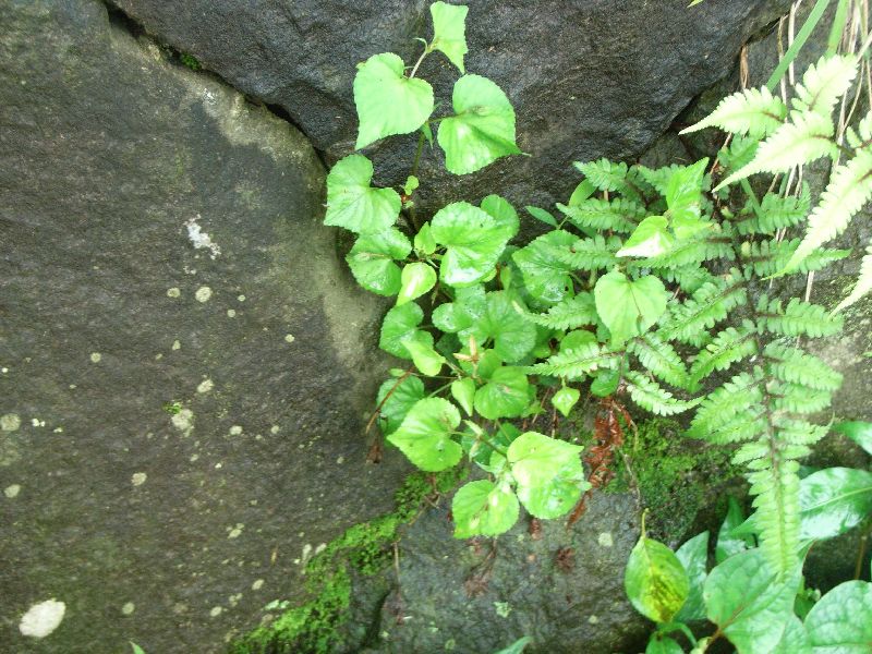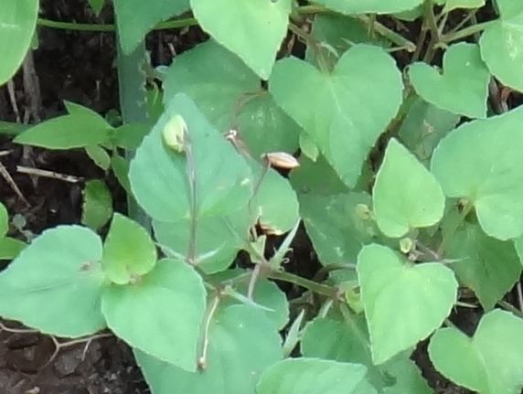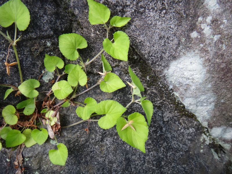 葉は幅2〜4センチの心形で、基部は深く湾入する。