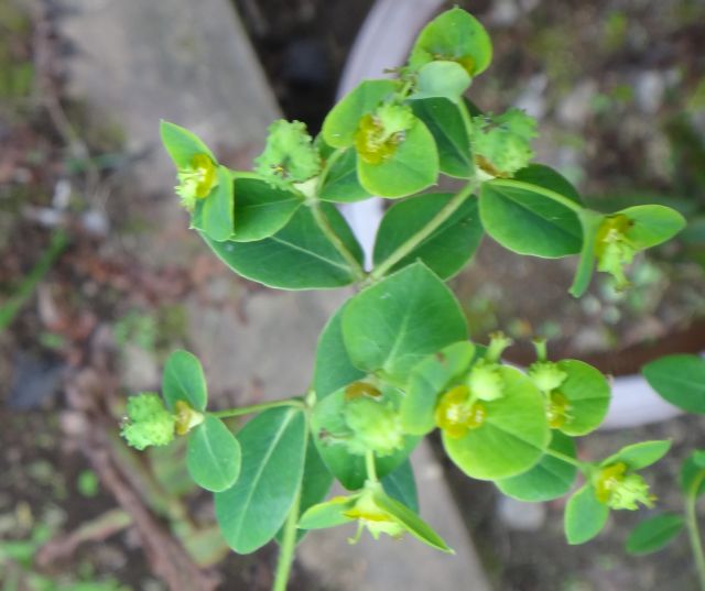 その先に黄緑色の杯状花序を(数段にわたって)いくつもつける。
