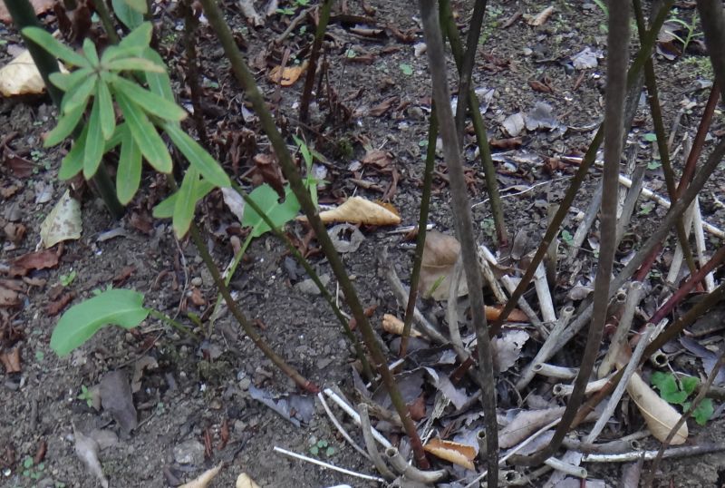 この例では、茎先から斜上する5本の枝の先に、2〜3枚の苞葉が輪生して、直ちに杯状花序をのせている。