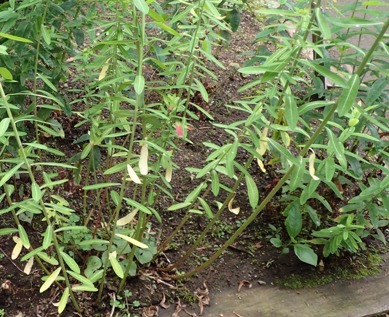 中央の花が結実すると脇の蕾の柄がのびて開花する?。(2016/10/4)