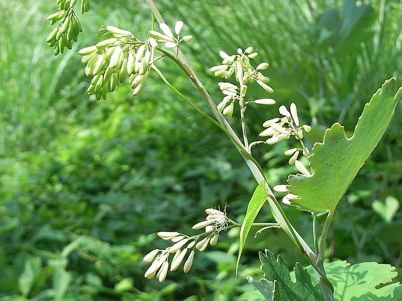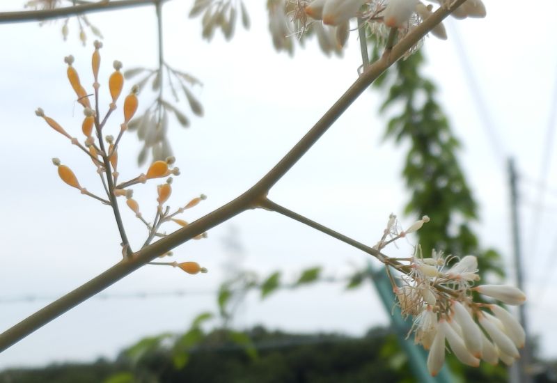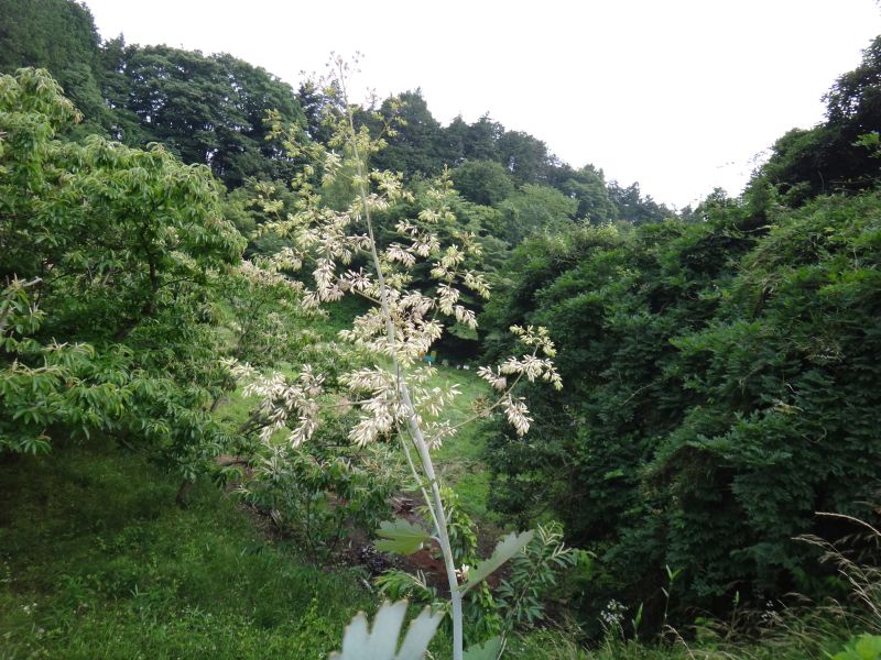 茎先に大きい円錐花序を出し、花弁のない白い花を