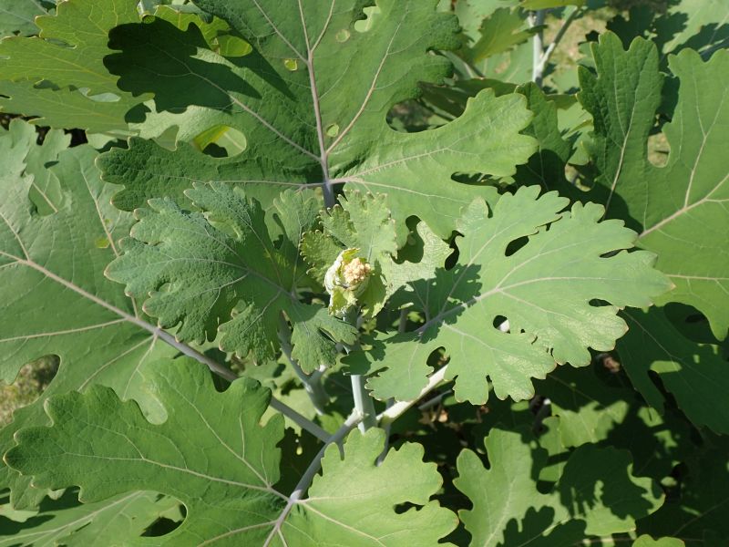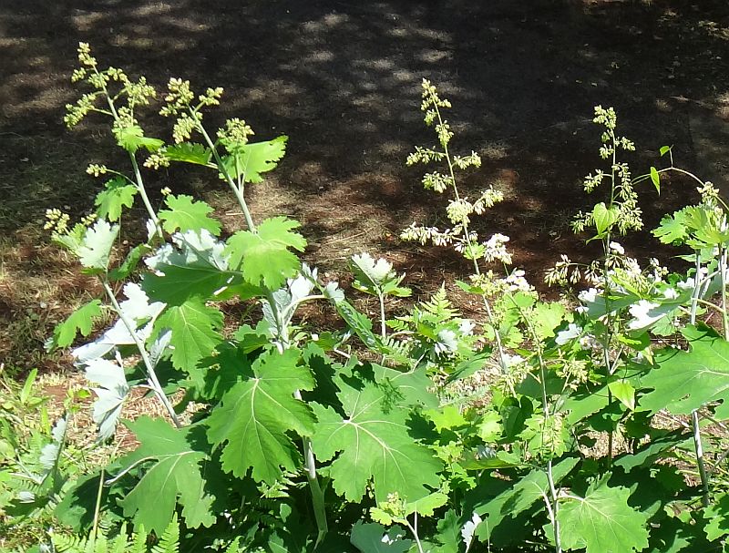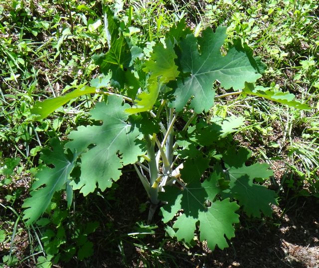 葉は長さ10〜30センチと大きく、掌状に中裂し、長い柄が