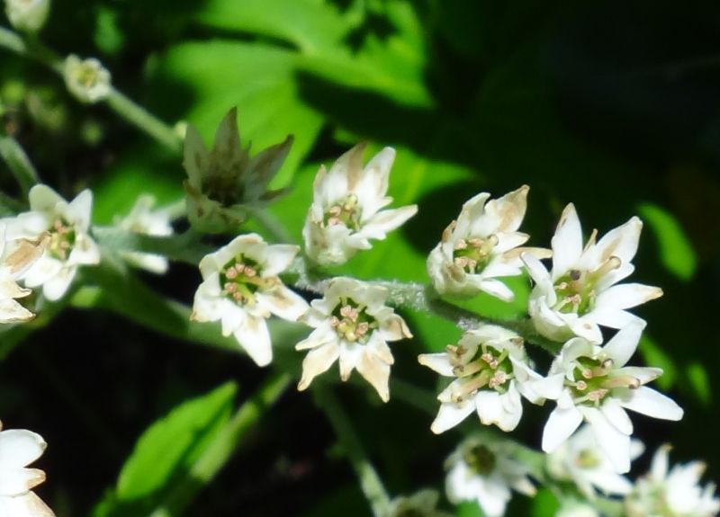 直径約5ミリの白い星形の花を集散状に多数つける。