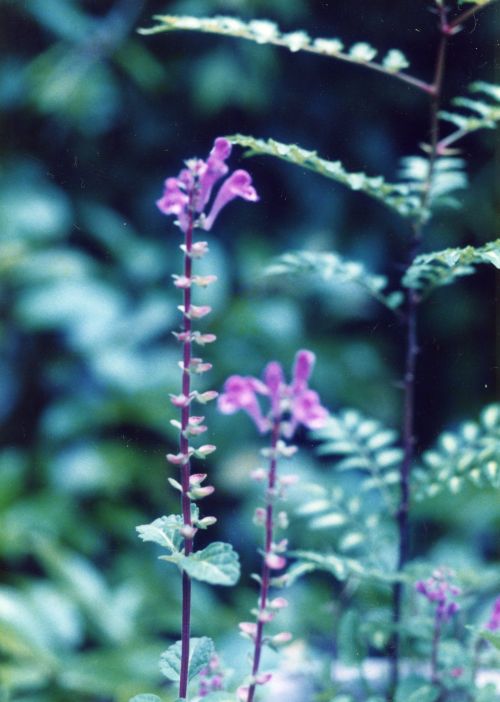 初夏に茎の先に穂状花序を出し、同じ方向に向いた唇形の花をいくつもつける。
