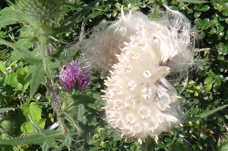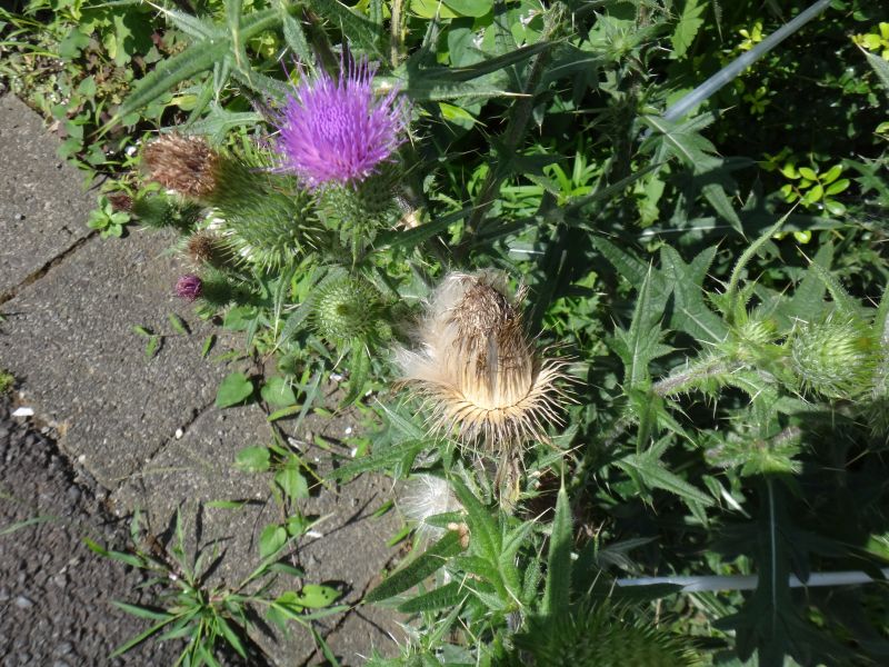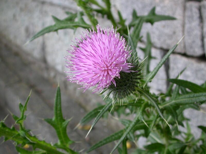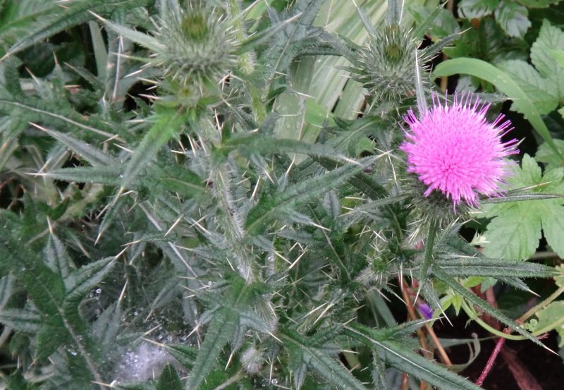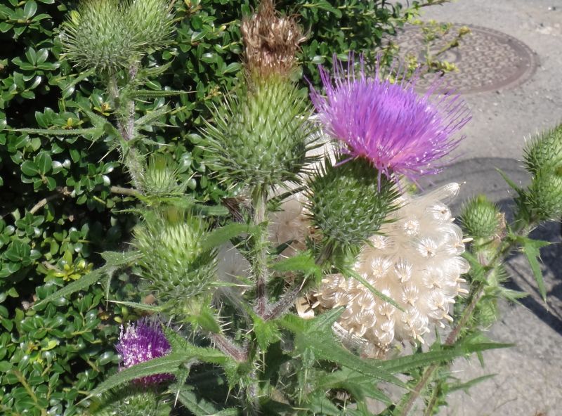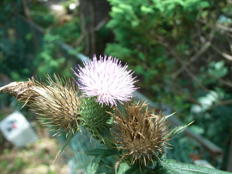 頭花は筒状花の集まりで、総苞片に棘がある。