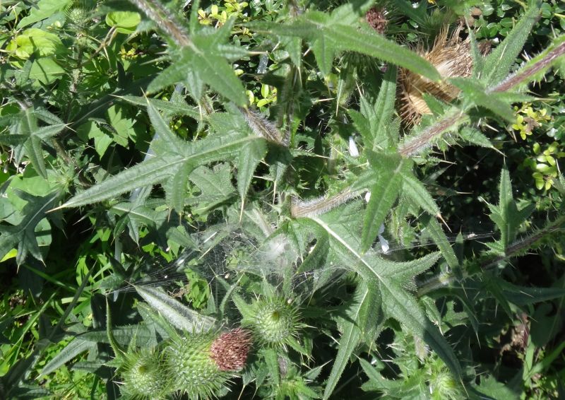 茎葉は互生し、羽状に裂け、縁に鋭い剣があり、茎を抱く。