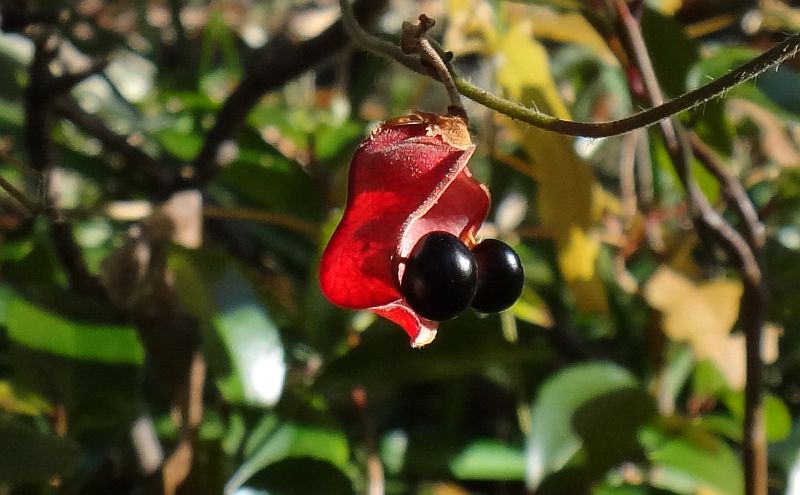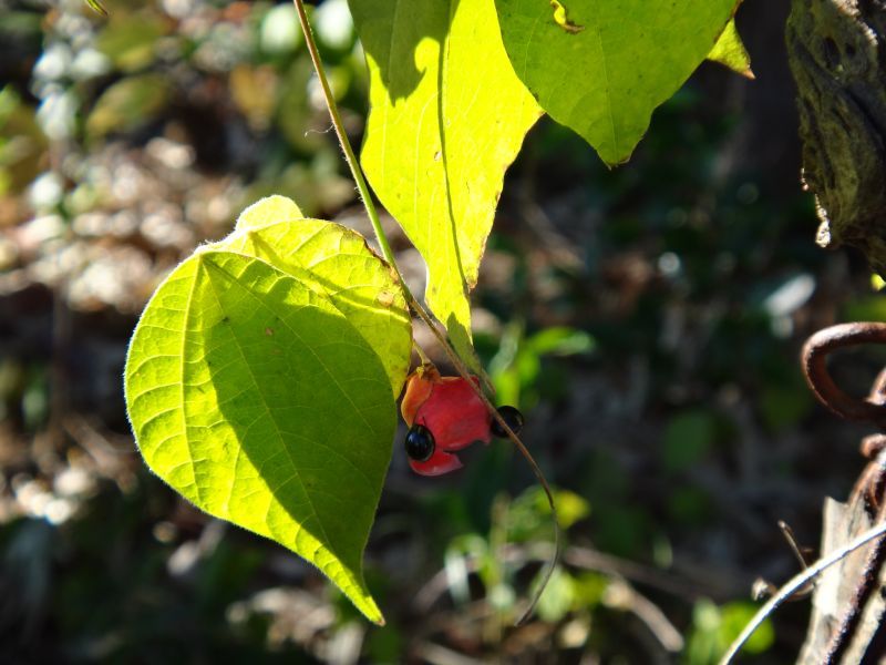 トキリマメ :葉は倒卵形で先尖り後半部が広い、花は総状で黄色、種子2個、鞘赤熟。