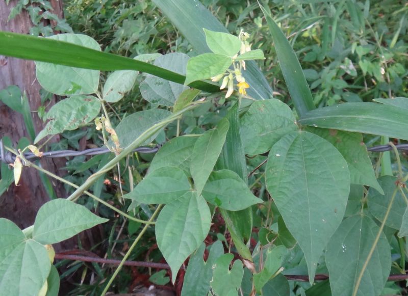 ノササゲ :葉は長卵形で先尖らず前半部が広い、花は総状で黄色、種子3〜5個、鞘紫色。