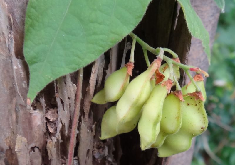 ヤブマメ :葉は広卵形で先尖らず、種子3〜5個、花は束生し紫色、鞘褐熟し縫合部に毛、地下茎にも豆果。