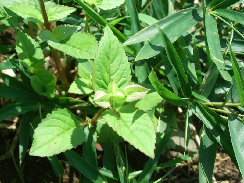 葉は心形〜尖った卵形で鋸歯があり、葉脈がへこみ、対生する。