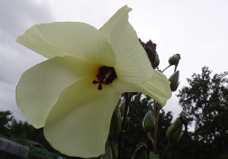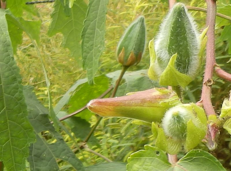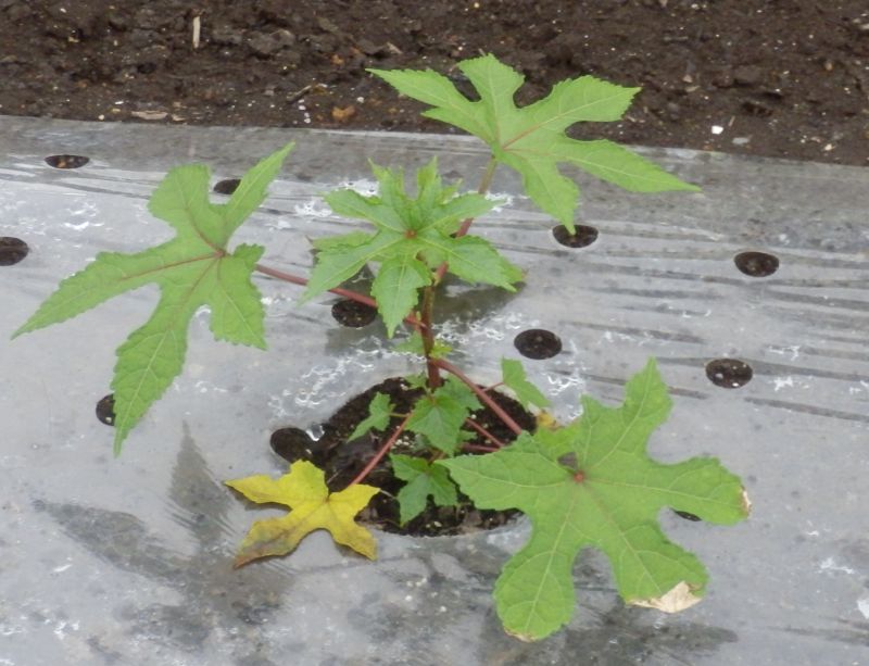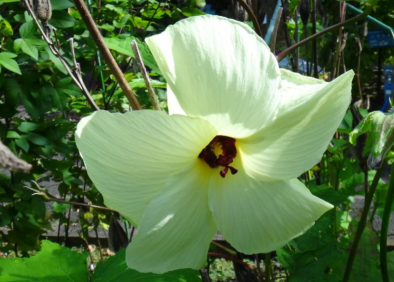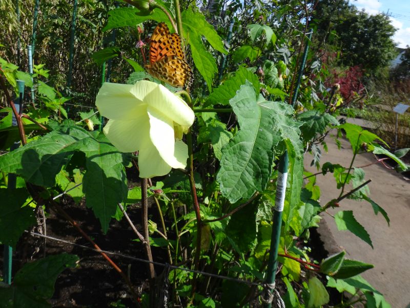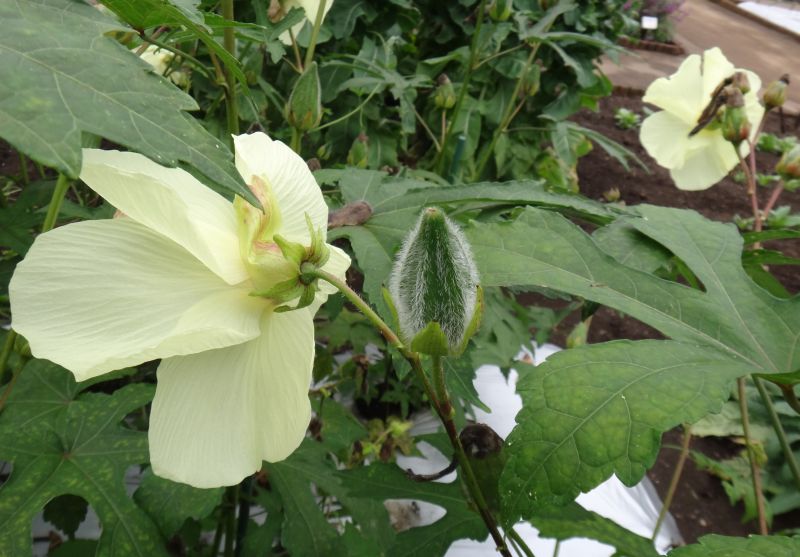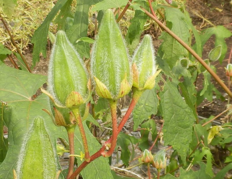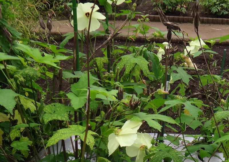オクラ :葉の裂片は広い、花は半開、果実は角形で柔らかい。
