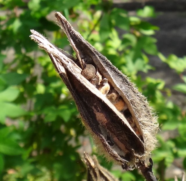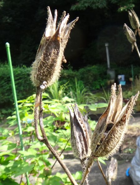 熟すと褐色になって5裂し、黒くて丸い種子を散らす。