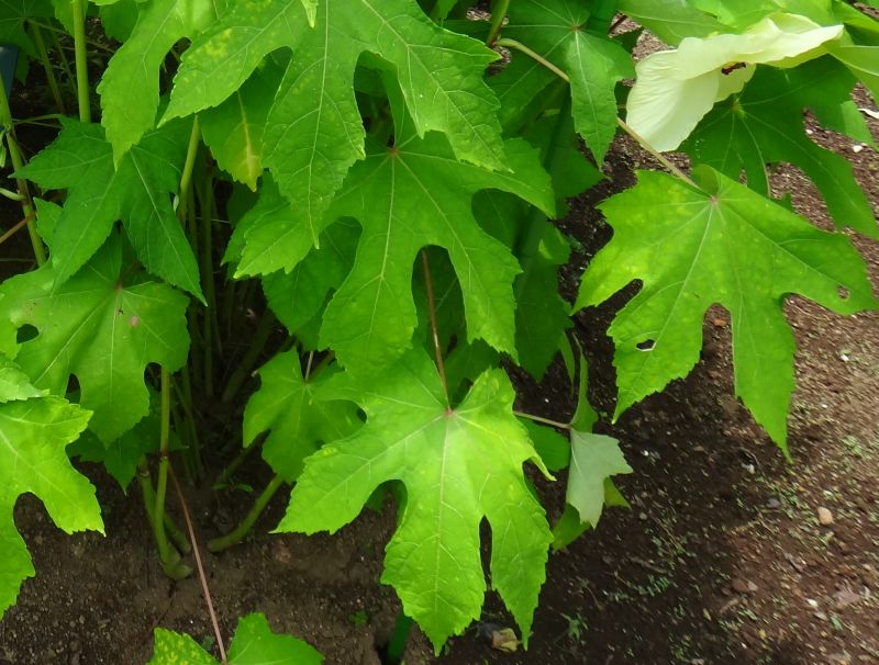 葉は掌状に5〜9裂し、粗い鋸歯があり、長い葉柄があって互生する。
