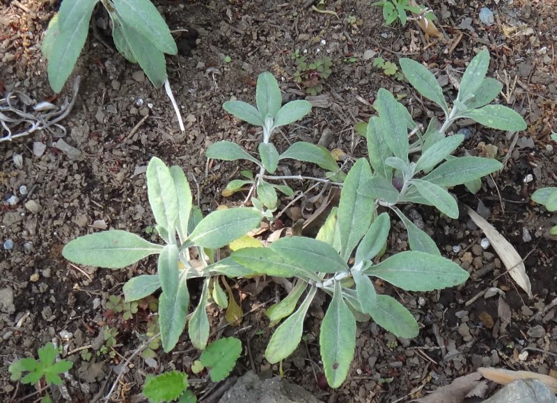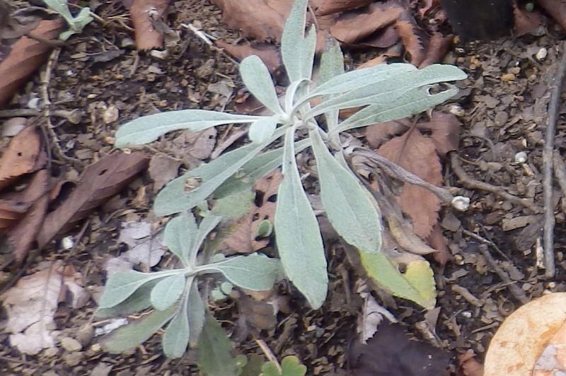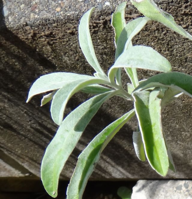 葉は倒披針形で対生し、白い綿毛に覆われる。