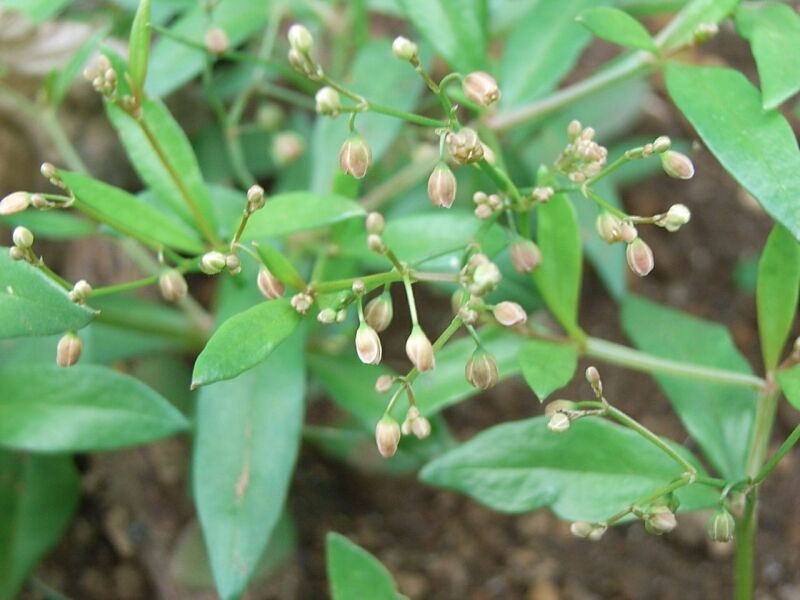 葉は披針形でザクロの葉ににており、偽輪生し、 花は直径約3ミリで、まばらな集散状につく。
