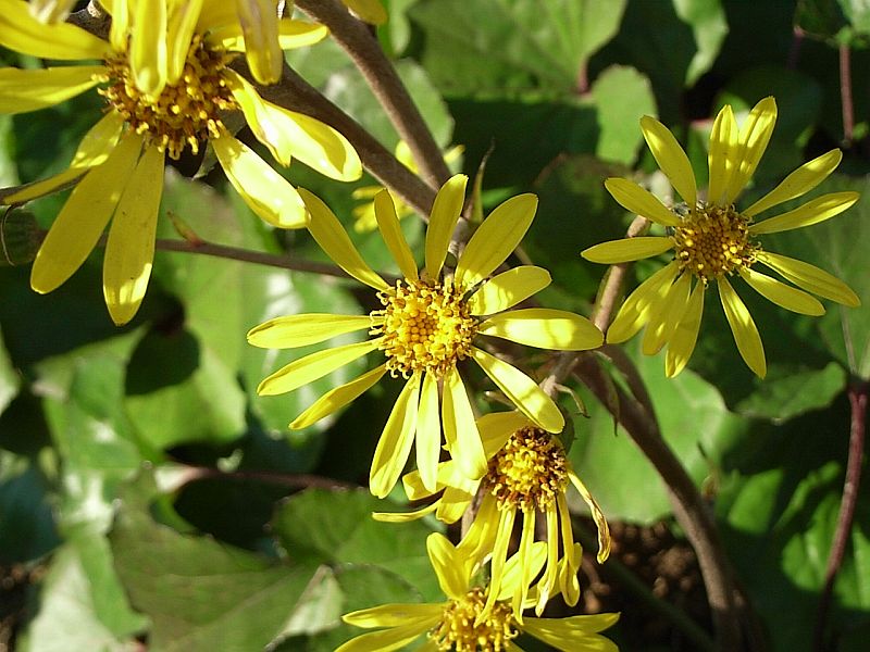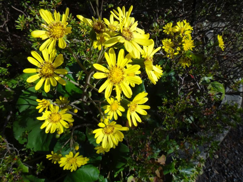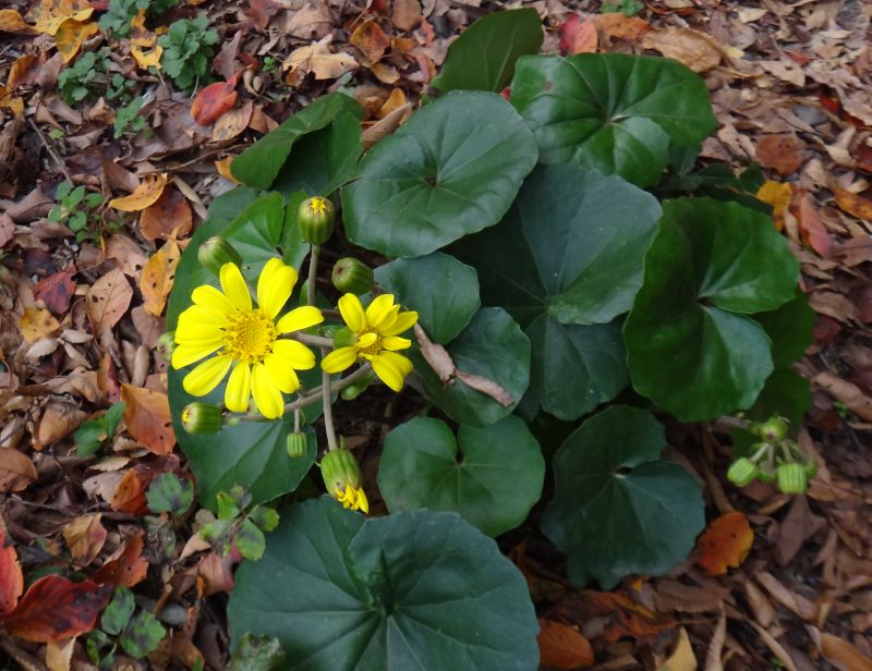 ツワブキ属、花は筒状花と舌状花をもつ。常緑、多年草。