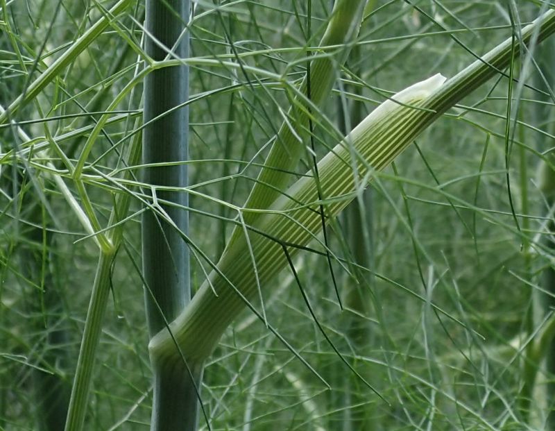 茎の上部では3〜4回羽状複葉の葉柄が鞘状になって茎を抱く。鞘に縞模様がある。
