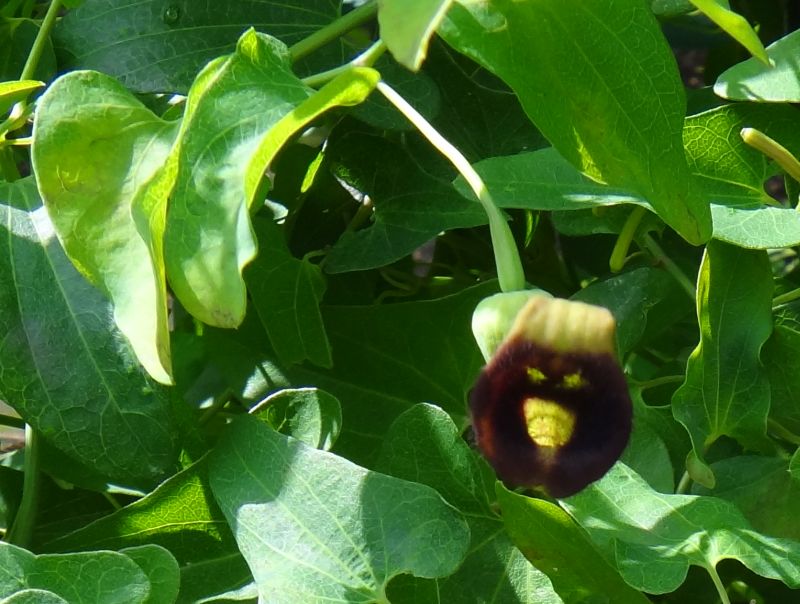ウマノスズクサ :葉は三角状卵形で基部張り出し、花は膨らみのあるラッパ形で暗紫色、刮ハは偏球形。