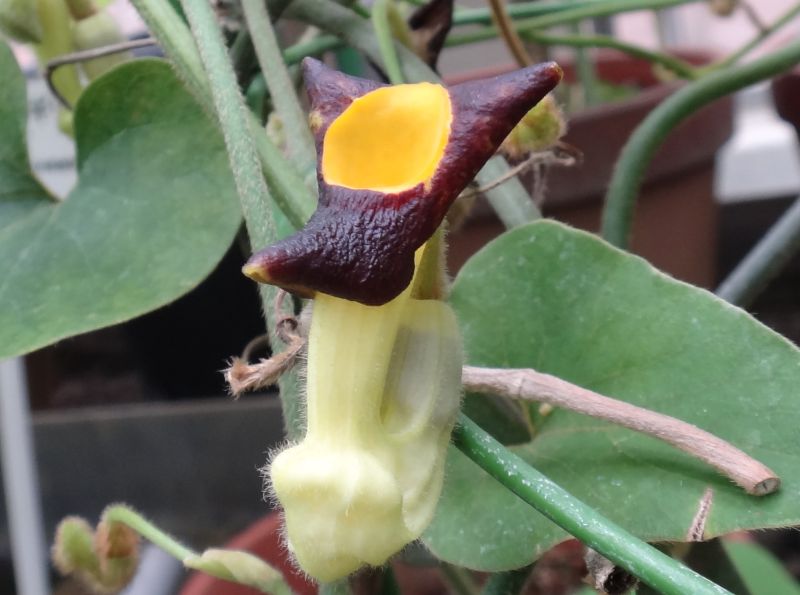 アリマウマノスズクサ。花筒の中が真っ黄色。(2016/3/16)