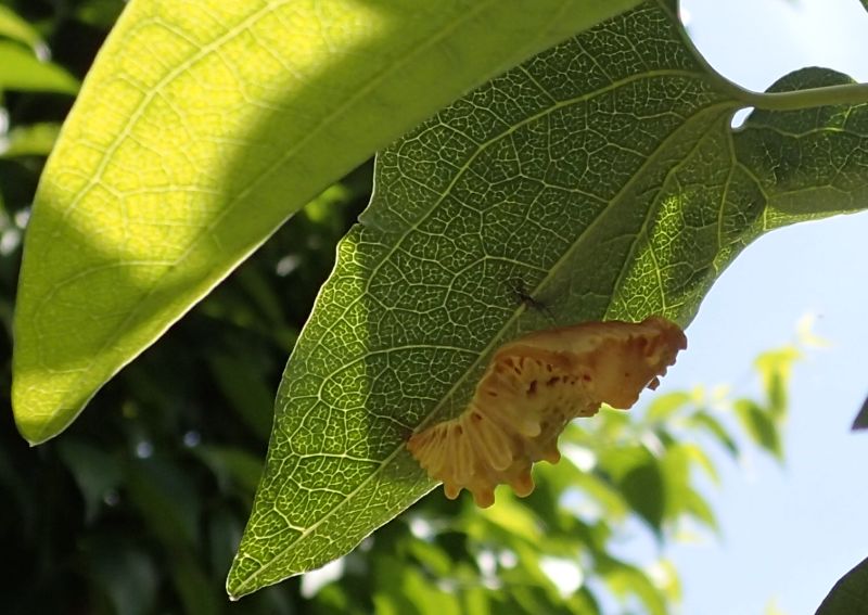 ウマノスズクサを食べるジャコウアゲハの蛹。
