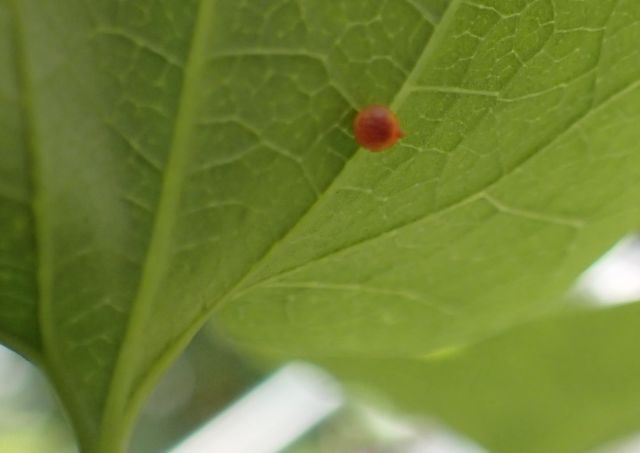 ジャコウアゲハの卵が産み付けられている。