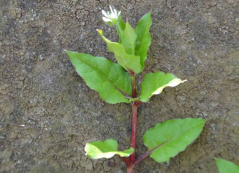 ウシハコベ :茎の節が暗紫色、葉は2〜7センチで縁が波打ち、花柱は5個。
