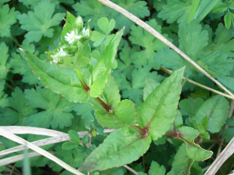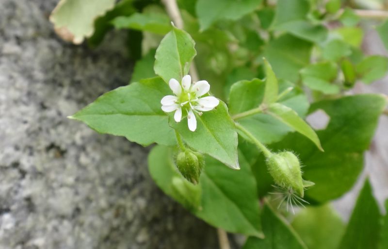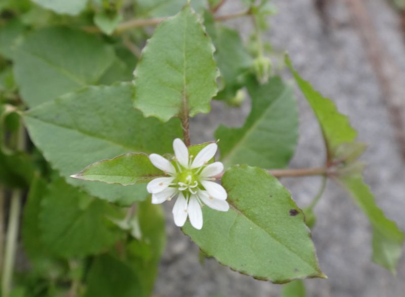ミドリハコベ:茎が緑色、葉は1〜2センチの卵形、花柱は3個、雄しべ5〜10本、種子に尖った突起密生。