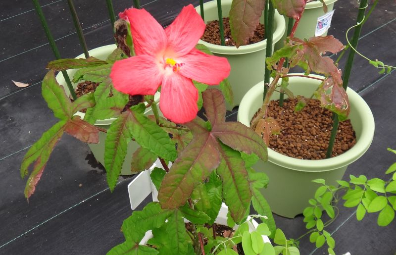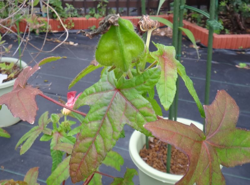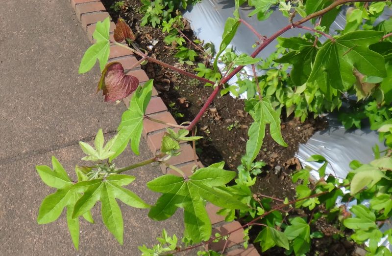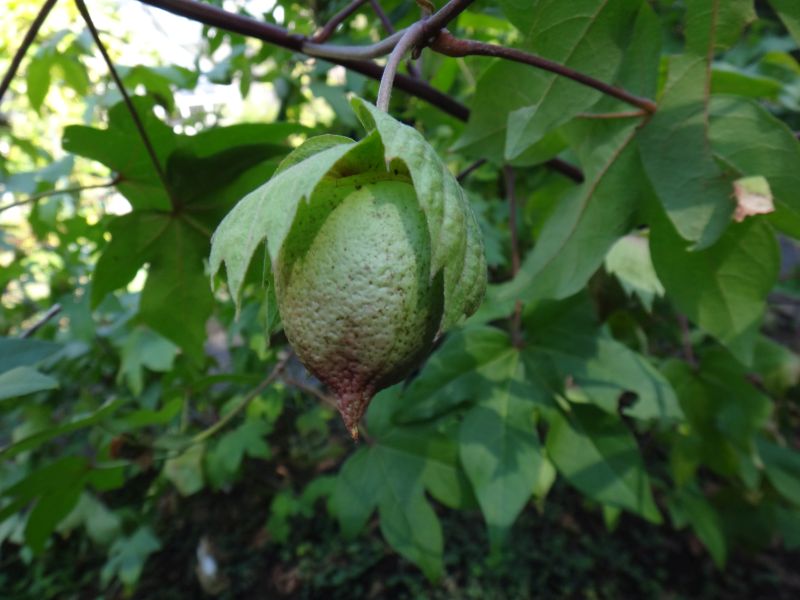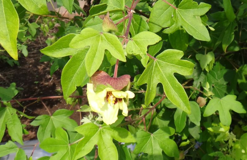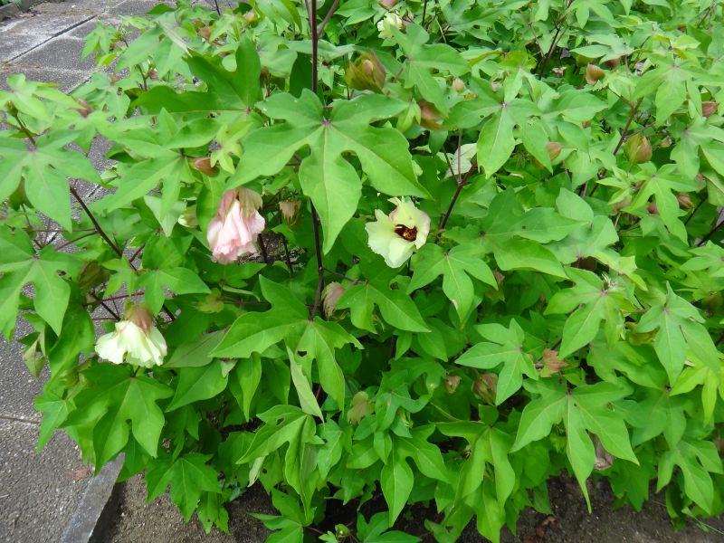 葉は互生し、葉柄が長く、葉身は直径8センチ弱で、掌状に3〜5裂する。