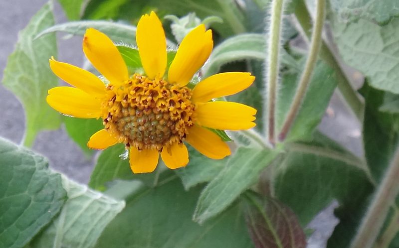 舌状花と筒状花がともに黄色い直径約4センチの花を咲かせる。