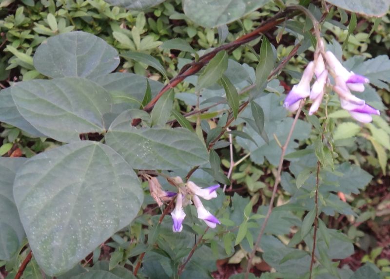 ヤブマメ :葉は広卵形で先尖らず、種子3〜5個、花は束生し紫色、鞘褐熟し縫合部に毛、地下茎にも豆果。