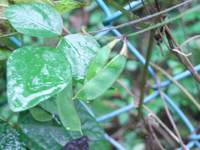 ノササゲ :葉は長卵形で先尖らず前半部が広い、花は総状で黄色、種子3〜5個、鞘紫色。