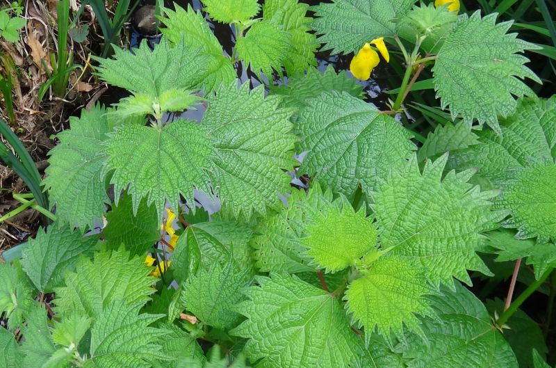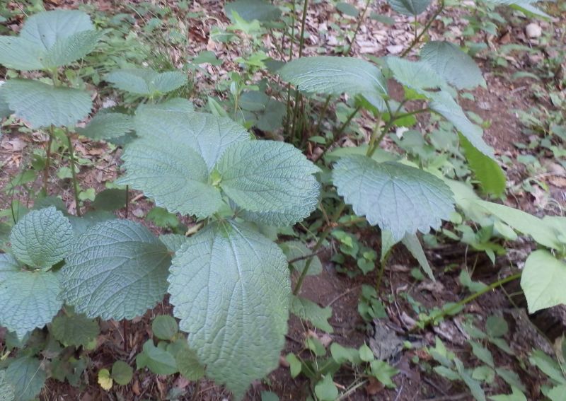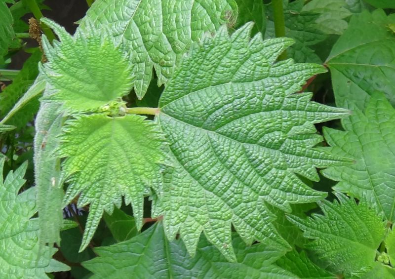 イラクサ :草、葉の基部は心形、先は3裂せずに尾状にとがり、欠刻状鋸歯、茎や葉柄、葉に棘。